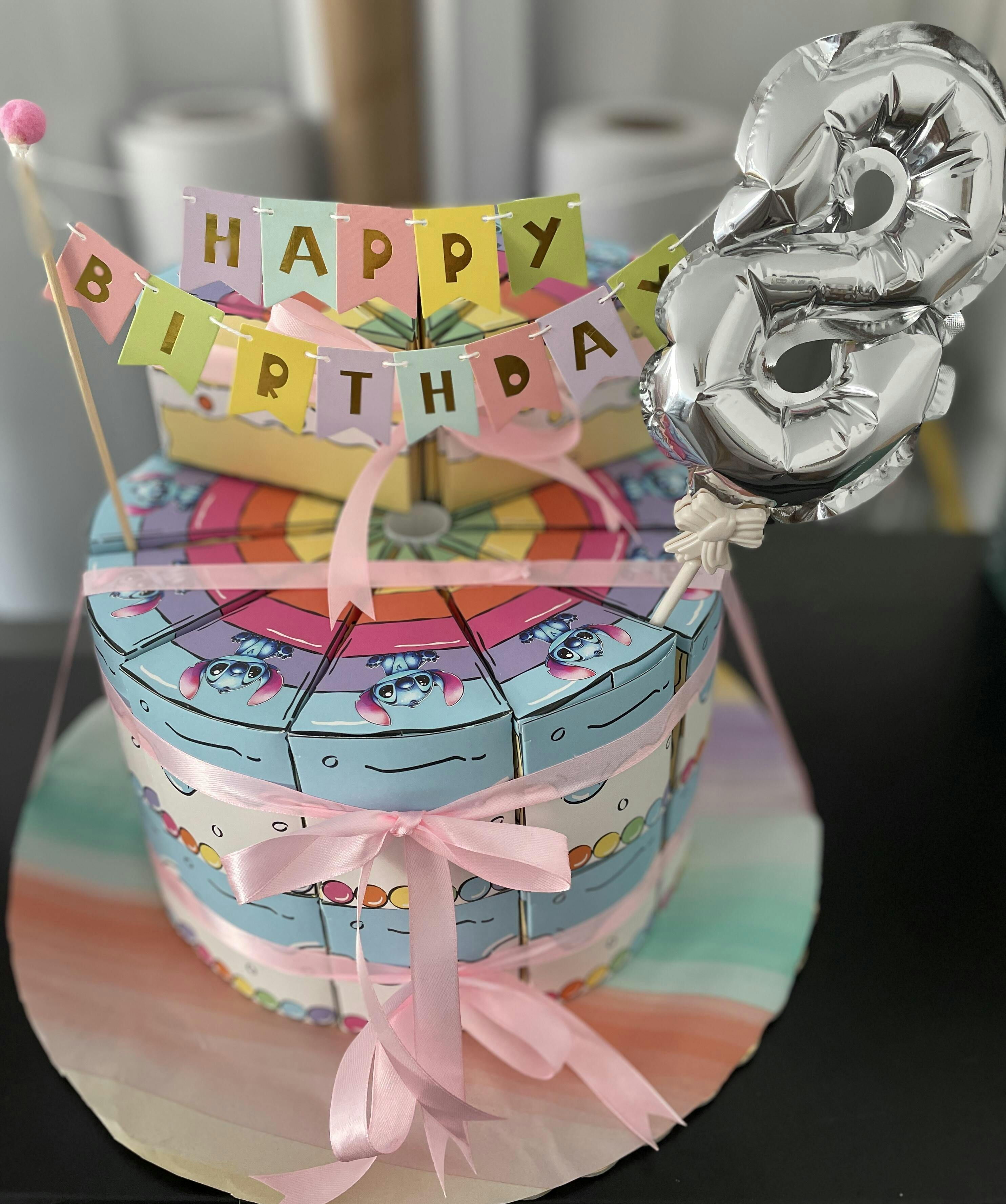 Cele 10 cutii triunghiulare, decorate în culorile vibrante ale curcubeului și stilizate cu o grafică de benzi desenate, se unesc pentru a forma un tort spectaculos, fiind completate de o panglică bleu elegantă care asigură stabilitatea ansamblului.